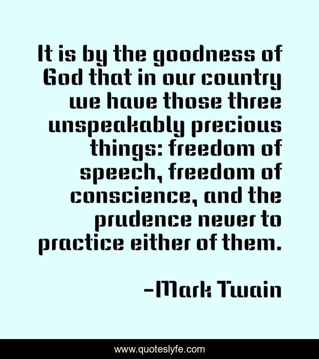 This page presents the quote "It is by the goodness of God that in our country we have those three unspeakably precious things: freedom of speech, freedom of conscience, and the prudence never to practice either of them.". Author of this quote is Mark Twain. This quote is about conscience, freedom,.
