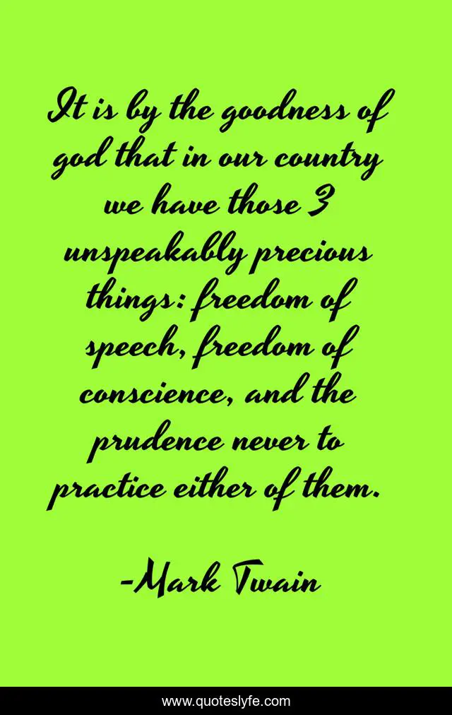This page presents the quote "It is by the goodness of god that in our country we have those 3 unspeakably precious things: freedom of speech, freedom of conscience, and the prudence never to practice either of them.". Author of this quote is Mark Twain. This quote is about politics, humor,.