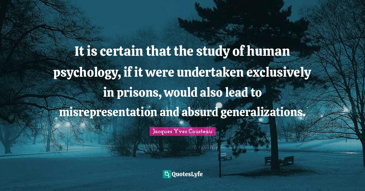 This page presents the quote "It is certain that the study of human psychology, if it were undertaken exclusively in prisons, would also lead to misrepresentation and absurd generalizations.". Author of this quote is Jacques Yves Cousteau. This quote is about certain, study, prison, absurd, misrepresentation, psychology,.