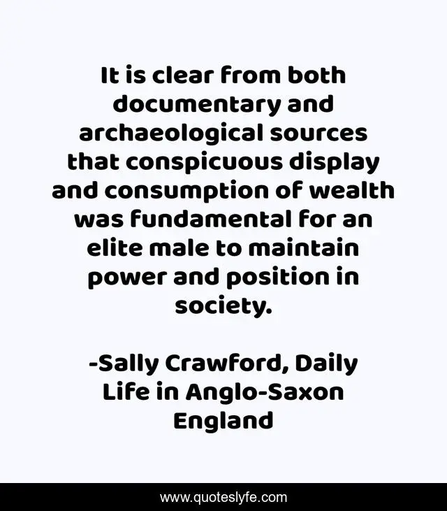 This page presents the quote "It is clear from both documentary and archaeological sources that conspicuous display and consumption of wealth was fundamental for an elite male to maintain power and position in society.". Author of this quote is Sally Crawford, Daily Life in Anglo-Saxon England. This quote is about society, nothing-changes, consumption, history,.