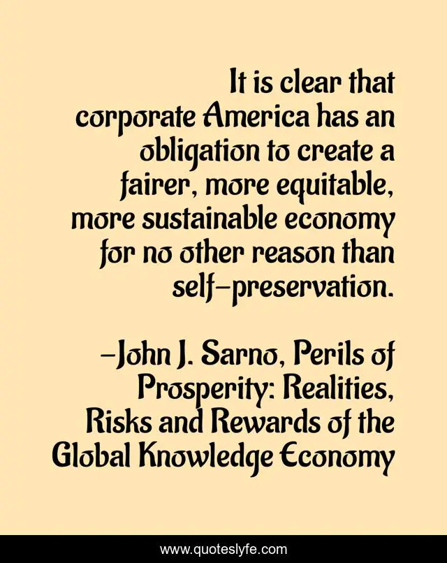 This page presents the quote "It is clear that corporate America has an obligation to create a fairer, more equitable, more sustainable economy for no other reason than self-preservation.". Author of this quote is John J. Sarno, Perils of Prosperity: Realities, Risks and Rewards of the Global Knowledge Economy. This quote is about ecology, equality, economy,.