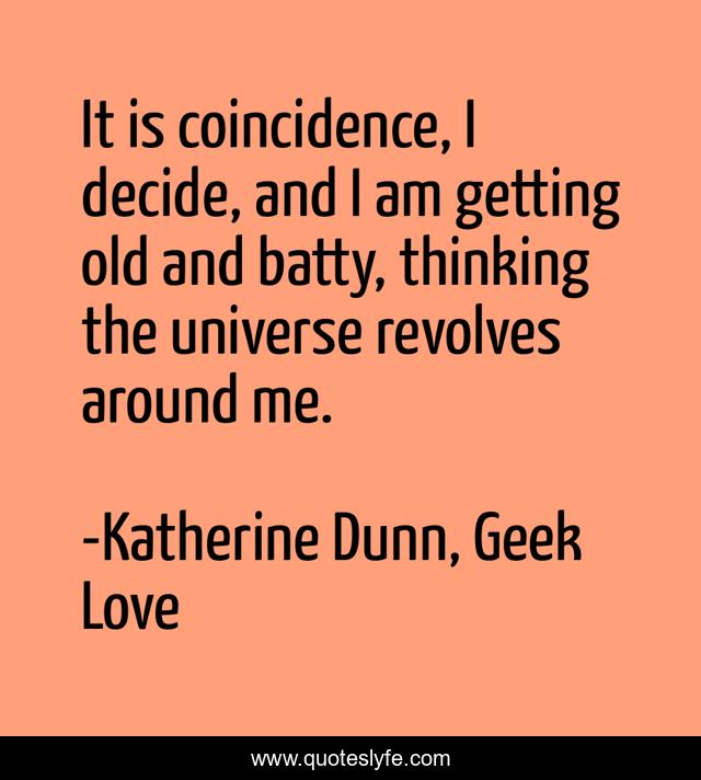 This page presents the quote "It is coincidence, I decide, and I am getting old and batty, thinking the universe revolves around me.". Author of this quote is Katherine Dunn, Geek Love. This quote is about aging, getting-old,.