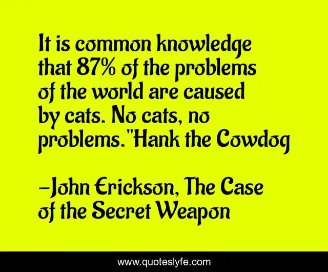 This page presents the quote "It is common knowledge that 87% of the problems of the world are caused by cats. No cats, no problems."Hank the Cowdog". Author of this quote is John Erickson, The Case of the Secret Weapon. This quote is about cats, kids-books, hank-the-cowdog,.