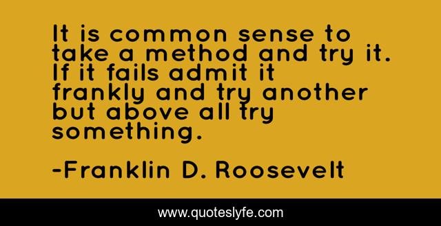 This page presents the quote "It is common sense to take a method and try it. If it fails admit it frankly and try another but above all try something.". Author of this quote is Franklin D. Roosevelt. This quote is about rule, government,.