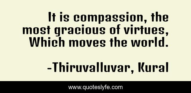 This page presents the quote "It is compassion, the most gracious of virtues, Which moves the world.". Author of this quote is Thiruvalluvar, Kural. This quote is about compassion, virtue,.