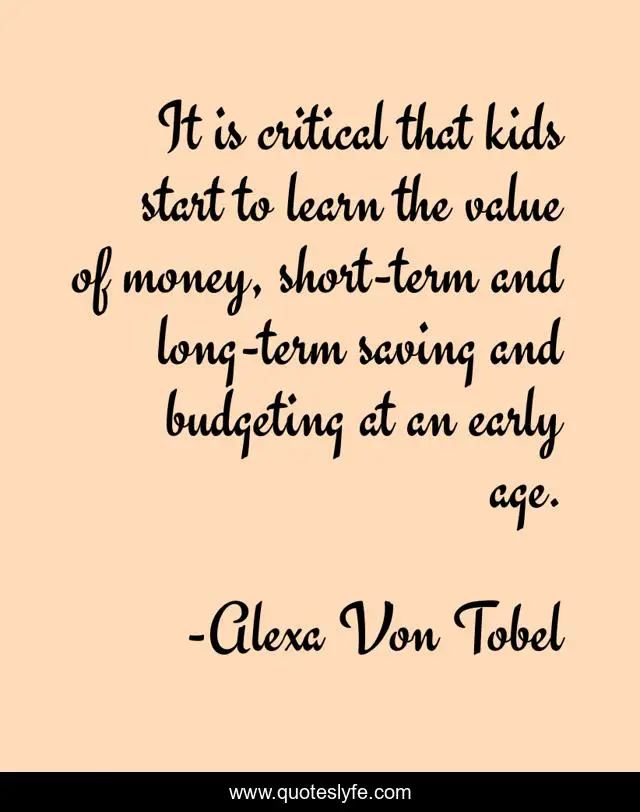 This page presents the quote "It is critical that kids start to learn the value of money, short-term and long-term saving and budgeting at an early age.". Author of this quote is Alexa Von Tobel. This quote is about money, value, start,.