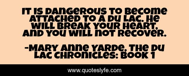 This page presents the quote "It is dangerous to become attached to a du Lac. He will break your heart, and you will not recover.". Author of this quote is Mary Anne Yarde, The Du Lac Chronicles: Book 1. This quote is about medieval, myth, lancelot, romance, fantasy, king-arthur,.