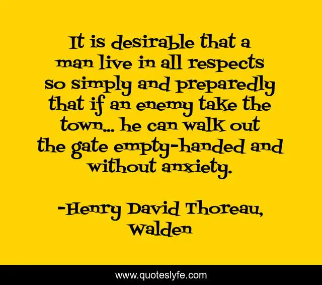 This page presents the quote "It is desirable that a man live in all respects so simply and preparedly that if an enemy take the town... he can walk out the gate empty-handed and without anxiety.". Author of this quote is Henry David Thoreau, Walden. This quote is about empty-handed, simple, simple-living, simple-life, simplicity,.