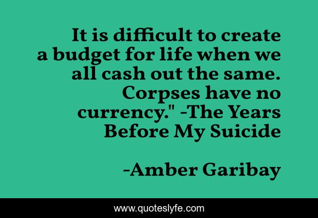 This page presents the quote "It is difficult to create a budget for life when we all cash out the same. Corpses have no currency." -The Years Before My Suicide". Author of this quote is Amber Garibay. This quote is about money, values-in-life, budgeting, finance, value,.