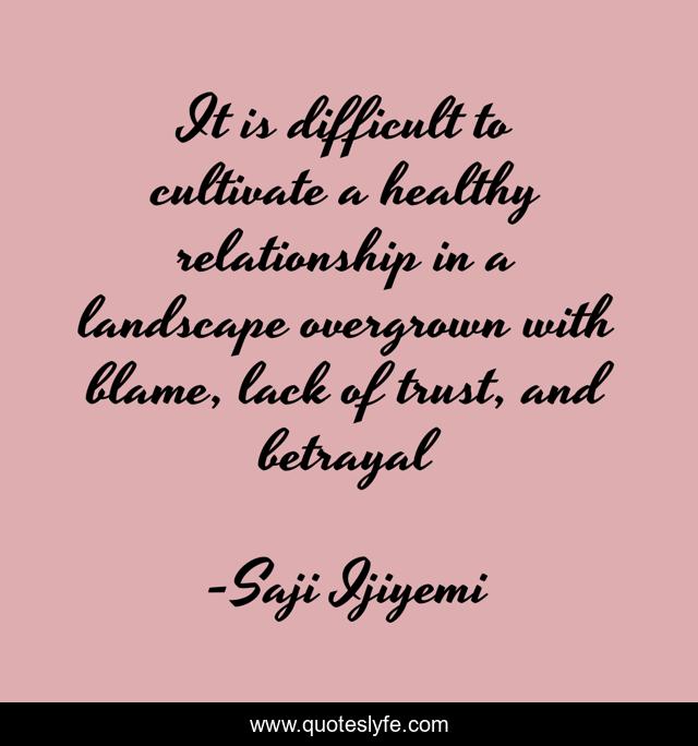 This page presents the quote "It is difficult to cultivate a healthy relationship in a landscape overgrown with blame, lack of trust, and betrayal". Author of this quote is Saji Ijiyemi. This quote is about relationships, love, relationship, trust, friendship, affection,.