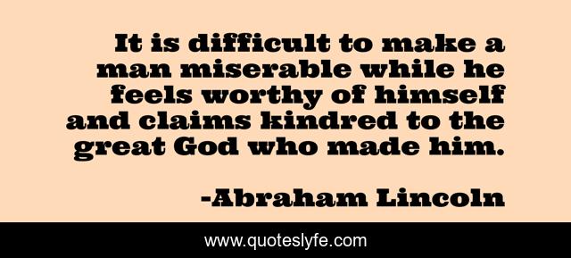 This page presents the quote "It is difficult to make a man miserable while he feels worthy of himself and claims kindred to the great God who made him.". Author of this quote is Abraham Lincoln. This quote is about faith, serenity, self-worth,.