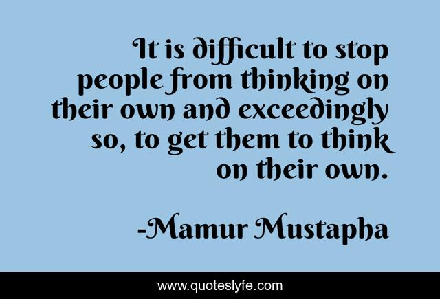 This page presents the quote "It is difficult to stop people from thinking on their own and exceedingly so, to get them to think on their own.". Author of this quote is Mamur Mustapha. This quote is about life, people, thinking, mind, originality, truth, propaganda,.