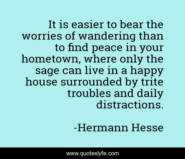 This page presents the quote "It is easier to bear the worries of wandering than to find peace in your hometown, where only the sage can live in a happy house surrounded by trite troubles and daily distractions.". Author of this quote is Hermann Hesse. .