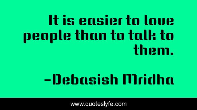 This page presents the quote "It is easier to love people than to talk to them.". Author of this quote is Debasish Mridha. This quote is about talk-to-people, debasish, mridha, philosophy, debasish-mridha, easier-to-love, love-people,.