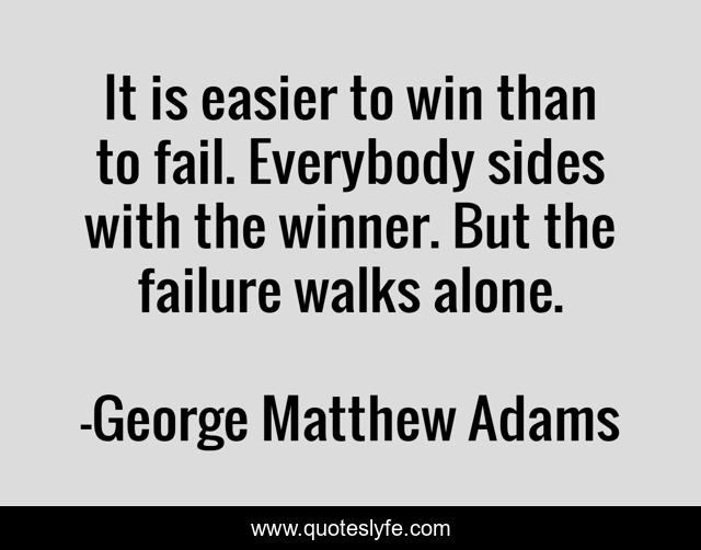 This page presents the quote "It is easier to win than to fail. Everybody sides with the winner. But the failure walks alone.". Author of this quote is George Matthew Adams. This quote is about alone, win, winner,.