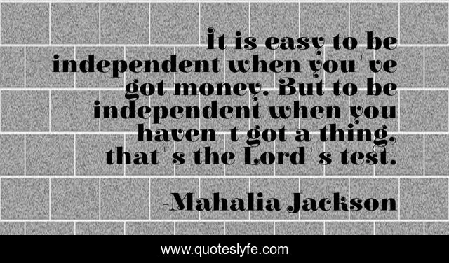 This page presents the quote "It is easy to be independent when you've got money. But to be independent when you haven't got a thing, that's the Lord's test.". Author of this quote is Mahalia Jackson. This quote is about money, easy,.