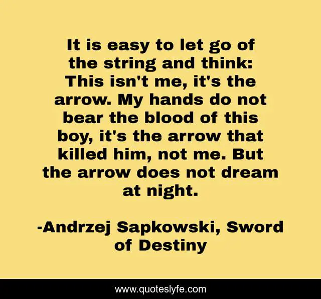 This page presents the quote "It is easy to let go of the string and think: This isn't me, it's the arrow. My hands do not bear the blood of this boy, it's the arrow that killed him, not me. But the arrow does not dream at night.". Author of this quote is Andrzej Sapkowski, Sword of Destiny. This quote is about conscience, responsibility, accountability,.
