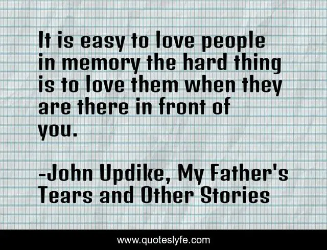 This page presents the quote "It is easy to love people in memory the hard thing is to love them when they are there in front of you.". Author of this quote is John Updike, My Father's Tears and Other Stories. This quote is about love, affection,.