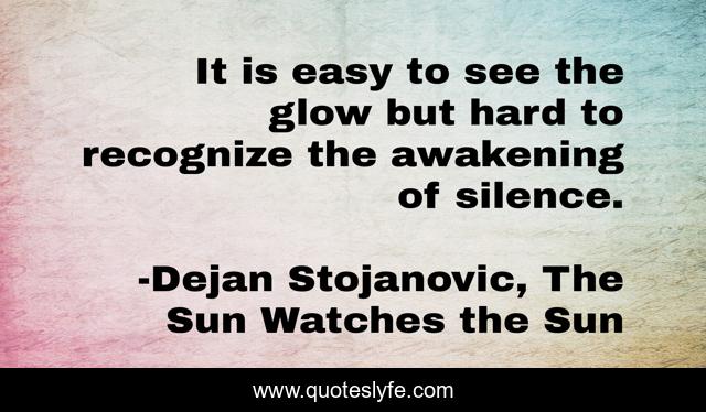 This page presents the quote "It is easy to see the glow but hard to recognize the awakening of silence.". Author of this quote is Dejan Stojanovic, The Sun Watches the Sun. This quote is about poets, literature, dejan-stojanovic, philosophy, poetry, wisdom, quotes, books, recognition,.