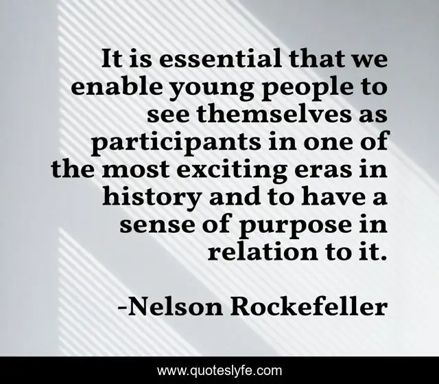 This page presents the quote "It is essential that we enable young people to see themselves as participants in one of the most exciting eras in history and to have a sense of purpose in relation to it.". Author of this quote is Nelson Rockefeller. .