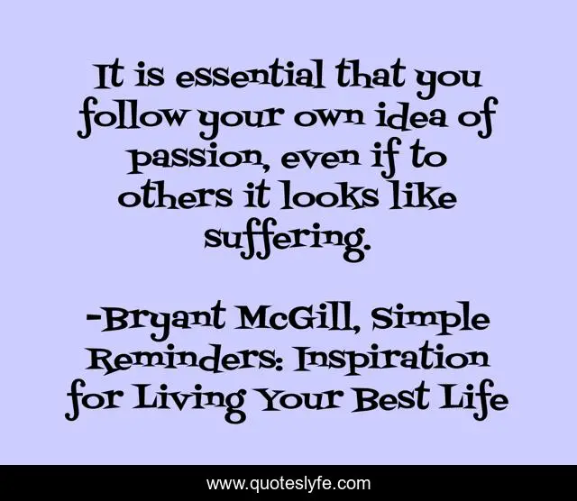 This page presents the quote "It is essential that you follow your own idea of passion, even if to others it looks like suffering.". Author of this quote is Bryant McGill, Simple Reminders: Inspiration for Living Your Best Life. This quote is about suffering, passion, essentials, ideas,.