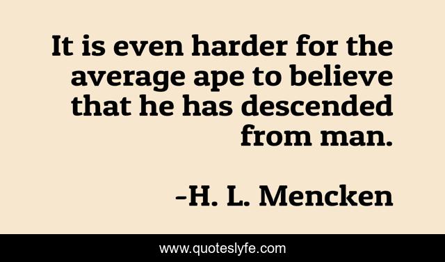 This page presents the quote "It is even harder for the average ape to believe that he has descended from man.". Author of this quote is H. L. Mencken. This quote is about average, believe, man,.