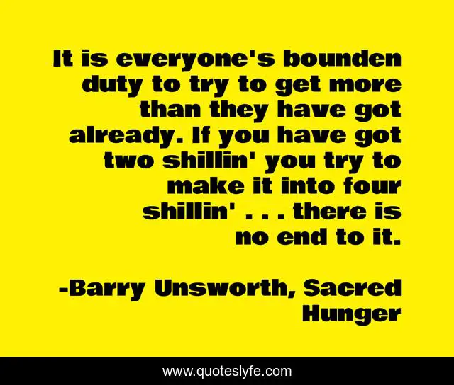 This page presents the quote "It is everyone's bounden duty to try to get more than they have got already. If you have got two shillin' you try to make it into four shillin' . . . there is no end to it.". Author of this quote is Barry Unsworth, Sacred Hunger. This quote is about money, free-enterprise, capitalism,.