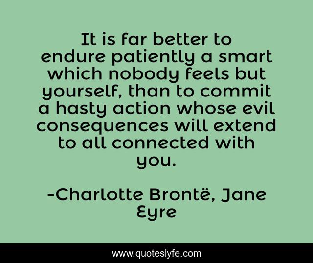 This page presents the quote "It is far better to endure patiently a smart which nobody feels but yourself, than to commit a hasty action whose evil consequences will extend to all connected with you.". Author of this quote is Charlotte Brontë, Jane Eyre. This quote is about patience, altruism, love, affection,.