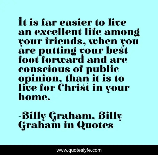 This page presents the quote "It is far easier to live an excellent life among your friends, when you are putting your best foot forward and are conscious of public opinion, than it is to live for Christ in your home.". Author of this quote is Billy Graham, Billy Graham in Quotes. This quote is about home, billy-graham,.