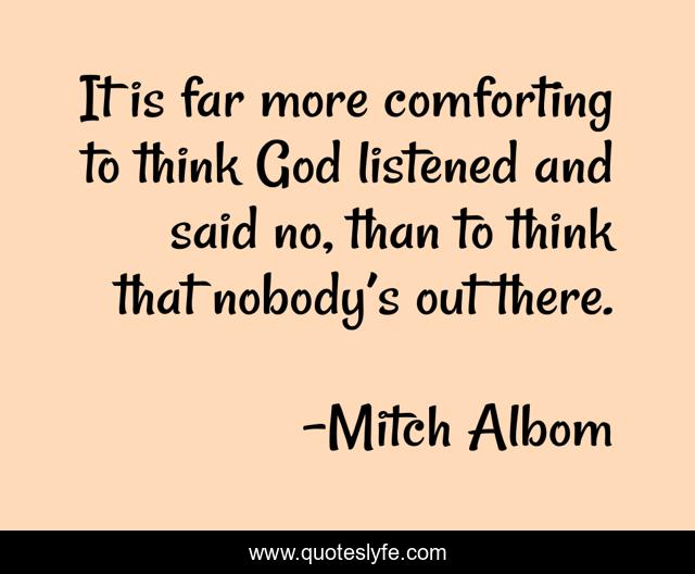 This page presents the quote "It is far more comforting to think God listened and said no, than to think that nobody’s out there.". Author of this quote is Mitch Albom. This quote is about god, belief,.
