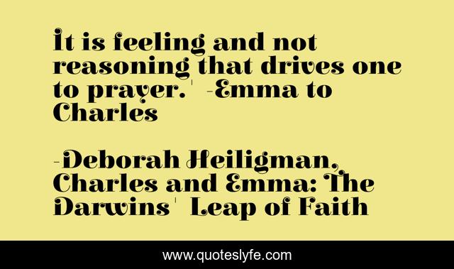 This page presents the quote "It is feeling and not reasoning that drives one to prayer.' -Emma to Charles". Author of this quote is Deborah Heiligman, Charles and Emma: The Darwins' Leap of Faith. .