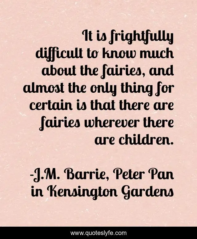 This page presents the quote "It is frightfully difficult to know much about the fairies, and almost the only thing for certain is that there are fairies wherever there are children.". Author of this quote is J.M. Barrie, Peter Pan in Kensington Gardens. This quote is about love, imagination, fairies, park, kensington-gardens, children, fantasy, london, barrie,.