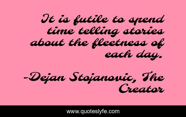 This page presents the quote "It is futile to spend time telling stories about the fleetness of each day.". Author of this quote is Dejan Stojanovic, The Creator. This quote is about the-creator, literature, dejan-stojanovic, futility, fleetness, days, poetry, quotes, stories,.