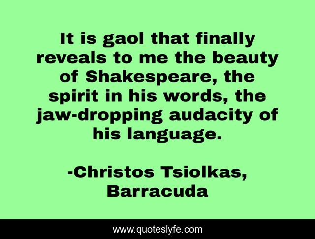 This page presents the quote "It is gaol that finally reveals to me the beauty of Shakespeare, the spirit in his words, the jaw-dropping audacity of his language.". Author of this quote is Christos Tsiolkas, Barracuda. .