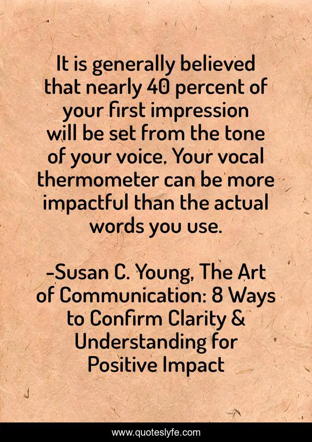 This page presents the quote "It is generally believed that nearly 40 percent of your first impression will be set from the tone of your voice. Your vocal thermometer can be more impactful than the actual words you use.". Author of this quote is Susan C. Young, The Art of Communication: 8 Ways to Confirm Clarity & Understanding for Positive Impact. This quote is about change-agent, relationship, customer-service, communication-skills, positive-first-impression, quotes-by-susan-c-young, susanspeaks-com, motivational-speaker-susan-young, employee-engagement,.