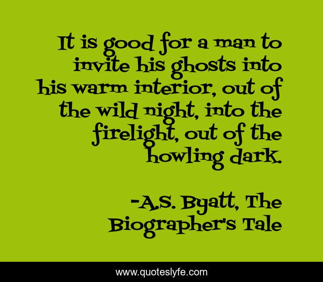 This page presents the quote "It is good for a man to invite his ghosts into his warm interior, out of the wild night, into the firelight, out of the howling dark.". Author of this quote is A.S. Byatt, The Biographer's Tale. .