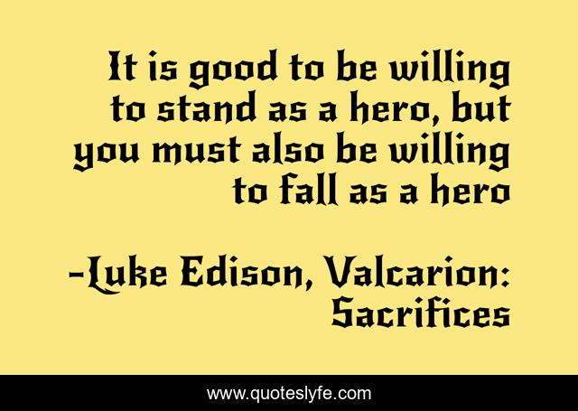 This page presents the quote "It is good to be willing to stand as a hero, but you must also be willing to fall as a hero". Author of this quote is Luke Edison, Valcarion: Sacrifices. This quote is about teen, hero, young, fantasy, young-adult-fiction, adventure, young-adult,.