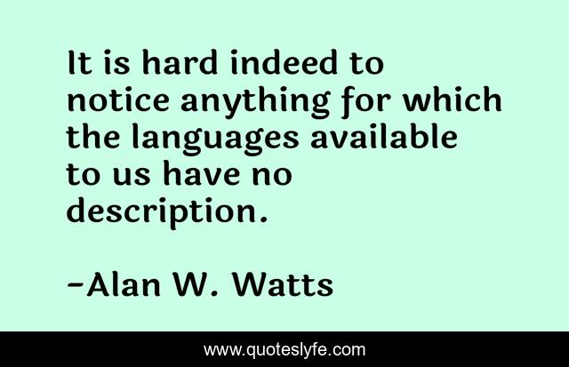 This page presents the quote "It is hard indeed to notice anything for which the languages available to us have no description.". Author of this quote is Alan W. Watts. This quote is about translation, power-of-words, language, reality,.