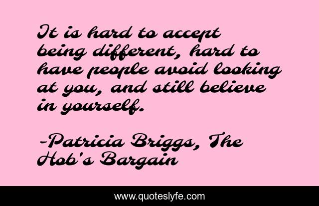 This page presents the quote "It is hard to accept being different, hard to have people avoid looking at you, and still believe in yourself.". Author of this quote is Patricia Briggs, The Hob's Bargain. .
