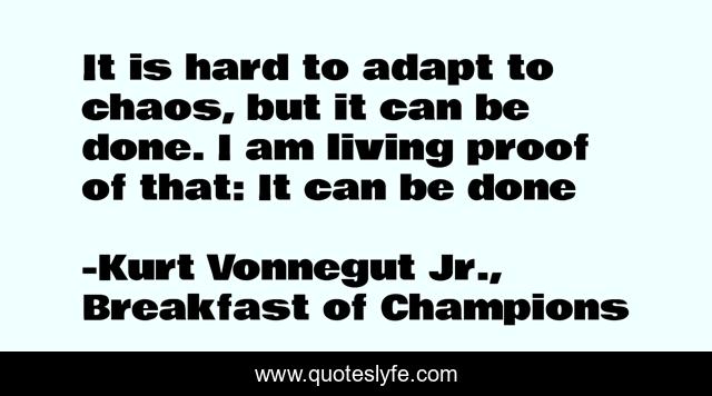This page presents the quote "It is hard to adapt to chaos, but it can be done. I am living proof of that: It can be done". Author of this quote is Kurt Vonnegut Jr., Breakfast of Champions. This quote is about survival, chaos, hope, proof,.