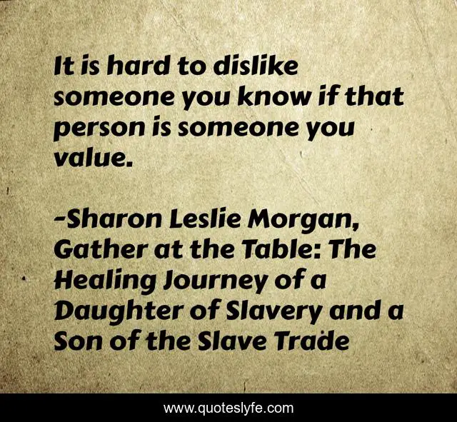 "Sharon Leslie Morgan, Gather at the Table: The Healing Journey of a Daughter of Slavery and a Son of the Slave Trade Quotes." Quoteslyfe.com, 2025. Sat. 06 Dec. 2025. <https://www.quoteslyfe.com/quote/It-is-hard-to-dislike-someone-you-194474>.
