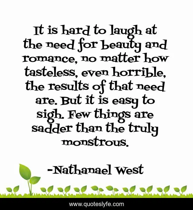 This page presents the quote "It is hard to laugh at the need for beauty and romance, no matter how tasteless, even horrible, the results of that need are. But it is easy to sigh. Few things are sadder than the truly monstrous.". Author of this quote is Nathanael West. .