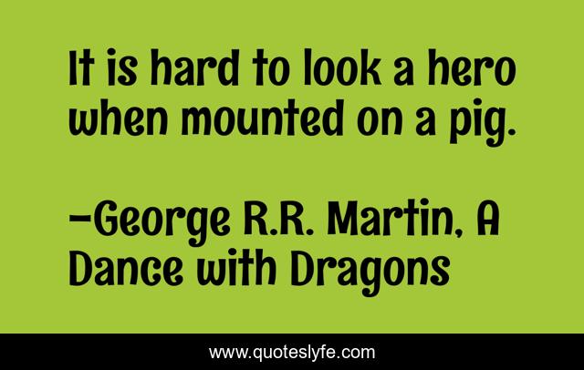 This page presents the quote "It is hard to look a hero when mounted on a pig.". Author of this quote is George R.R. Martin, A Dance with Dragons. This quote is about hero, pig,.