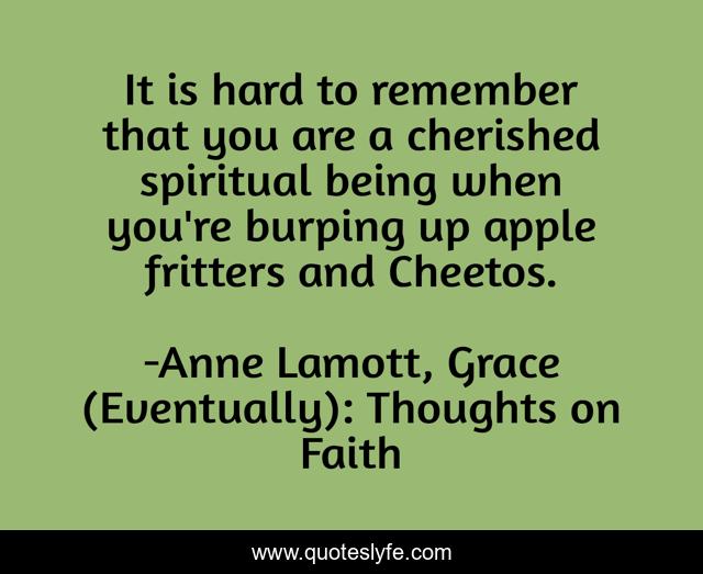 This page presents the quote "It is hard to remember that you are a cherished spiritual being when you're burping up apple fritters and Cheetos.". Author of this quote is Anne Lamott, Grace (Eventually): Thoughts on Faith. This quote is about enthusiasm, spiritual, inspirational,.