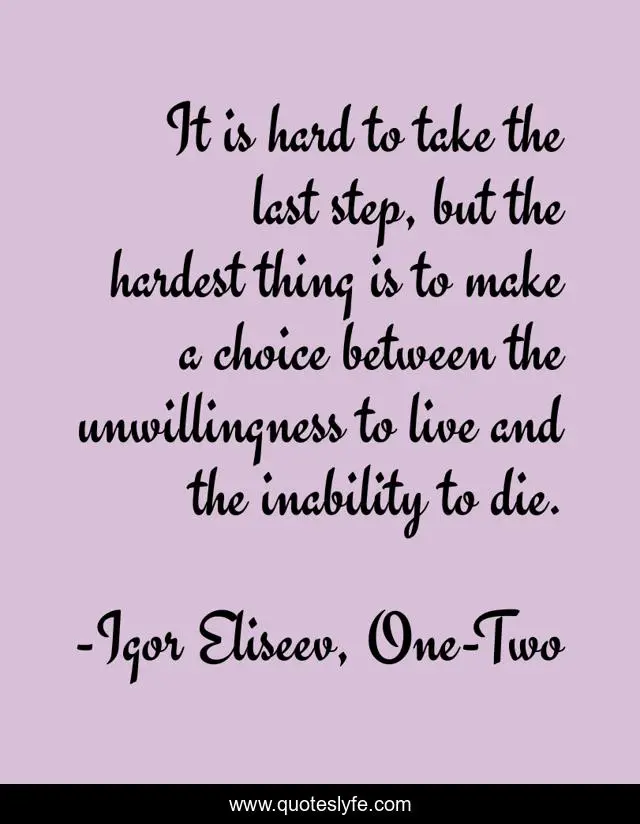 This page presents the quote "It is hard to take the last step, but the hardest thing is to make a choice between the unwillingness to live and the inability to die.". Author of this quote is Igor Eliseev, One-Two. This quote is about faith, life, two-souls, experience, dramatic-moment, drama, philosophical, inspirational, enthusiasm,.