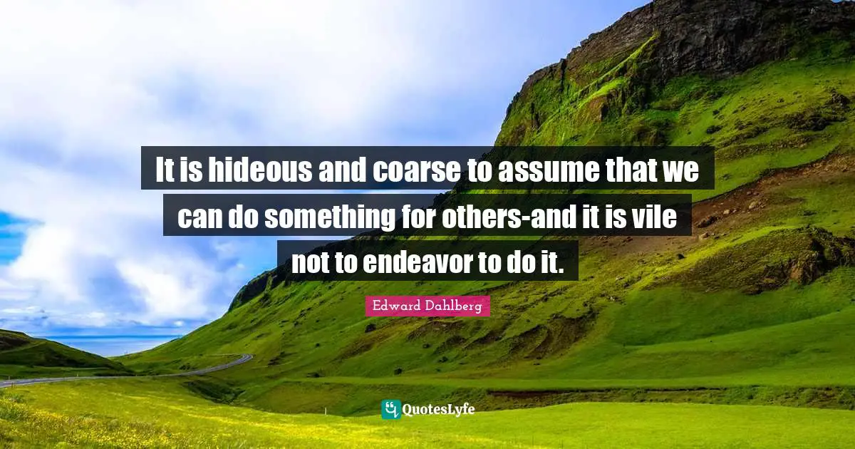 This page presents the quote "It is hideous and coarse to assume that we can do something for others-and it is vile not to endeavor to do it.". Author of this quote is Edward Dahlberg. This quote is about can do something, assuming, coarse, endeavor, hideous,.