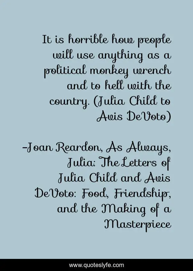 This page presents the quote "It is horrible how people will use anything as a political monkey wrench and to hell with the country. (Julia Child to Avis DeVoto)". Author of this quote is Joan Reardon, As Always, Julia: The Letters of Julia Child and Avis DeVoto: Food, Friendship, and the Making of a Masterpiece. This quote is about politics, government,.