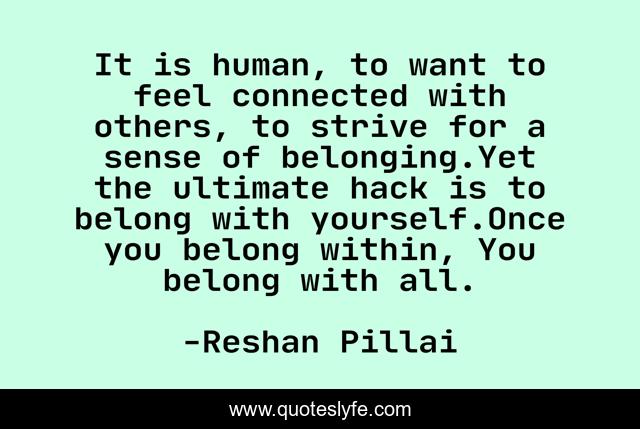 This page presents the quote "It is human, to want to feel connected with others, to strive for a sense of belonging.Yet the ultimate hack is to belong with yourself.Once you belong within, You belong with all.". Author of this quote is Reshan Pillai. This quote is about religion, self, self-realization, inspirational, enthusiasm, individualism,.