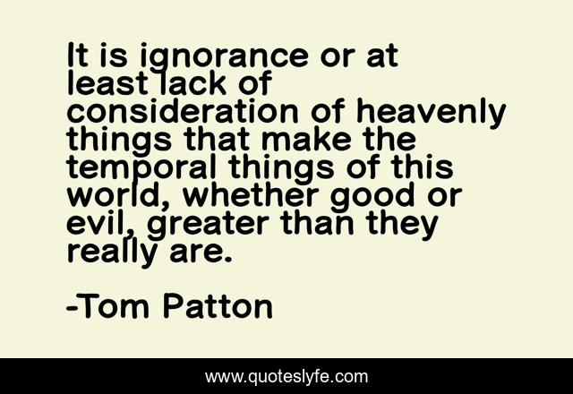 This page presents the quote "It is ignorance or at least lack of consideration of heavenly things that make the temporal things of this world, whether good or evil, greater than they really are.". Author of this quote is Tom Patton. This quote is about heaven, christ, god, christianity, christian-living, jesus,.