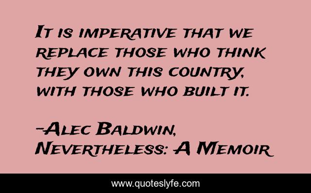 This page presents the quote "It is imperative that we replace those who think they own this country, with those who built it.". Author of this quote is Alec Baldwin, Nevertheless: A Memoir. .